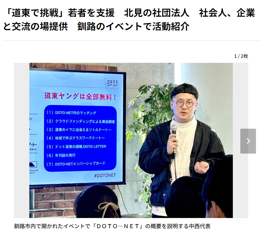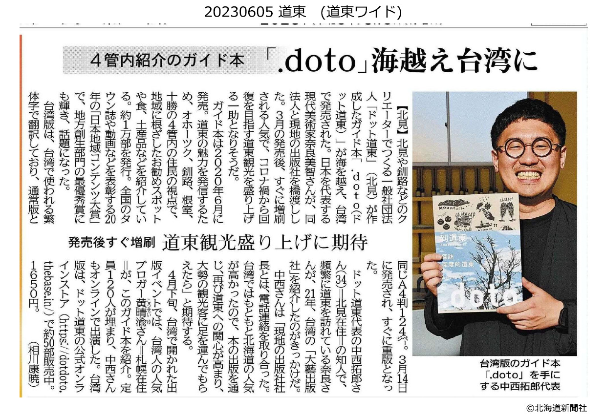 NEWS 2022.11.28道東のアンオフィシャルビジョンブック『.doto vol.2』が、日本地域情報コンテンツ大賞2022にてビジネスモデル部門最優秀賞を受賞しました ドット道東からのお知らせ道東のアンオフィシャルビジョンブック
